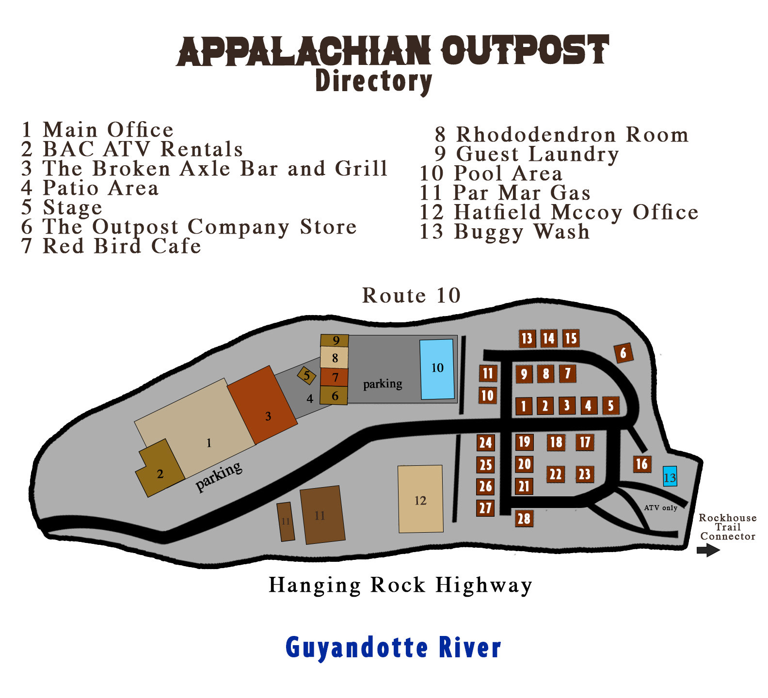 Rockfort Cabins is conveniently located within a ΒΌ mile of the Rockhouse Trail System. Rockfort guests have direct access to the Rockhouse Trail System without trailering their machine. Rockfort Cabins guests have access to over 300 miles of The Hatfield~McCoy Trail Systems (Rock House Trail, Devil Anse Trail and Buffalo Mountain Trail). The Rockhouse Trail System connects to the Devil Anse Trail System and the Devil Anse Trail System connects to the Buffalo Mountain Trail System near Williamson. Once you unload your machine, you do not have to load them back up until you are ready to go home! After a long day riding trails visit The Broken Axle a few footsteps from your cabin door.